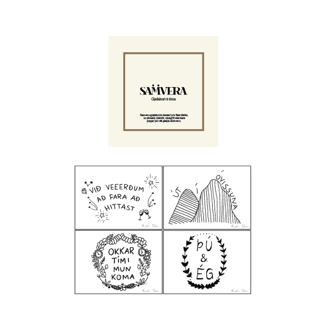 Samvera samanstendur af fjórum fallegum gjafakortum á samverustund sem listakonan Kridola myndskreytti. Kortin eru 21 x 21 cm og koma með umslögum. Ólíkt öðrum upplifunargjöfum býður þú viðkomandi í fyrirfram ákveðna samverustund með þér. Kortin eru tilvalin sem hversdags- og tækifærisgjöf fyrir fjölskyldumeðlimi, vini og félaga. Aftan á kortunum getur þú skrifað persónulega kveðju og þar er tilgreint í hverju samverustundin felst (nema þegar um óvissu er að ræða), dagsetning, tími og hvort viðkomandi þurfi að huga að einhverju sérstöku fyrir samveruna.